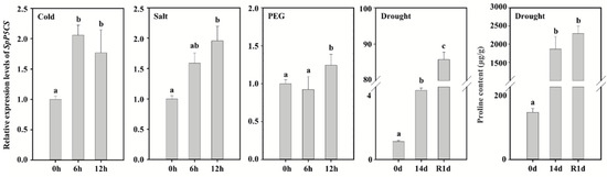 qPCR analysis of the expression levels of SpP5CS under cold, salt, drought and soil drought stress conditions. The experiment has three biological replicates, and the error bar denotes the standard deviation. The data are analyzed by one-way ANOVA (Tukey’s test). Different letters indicate significant differences among the relative expression levels of the genes at p < 0.05.