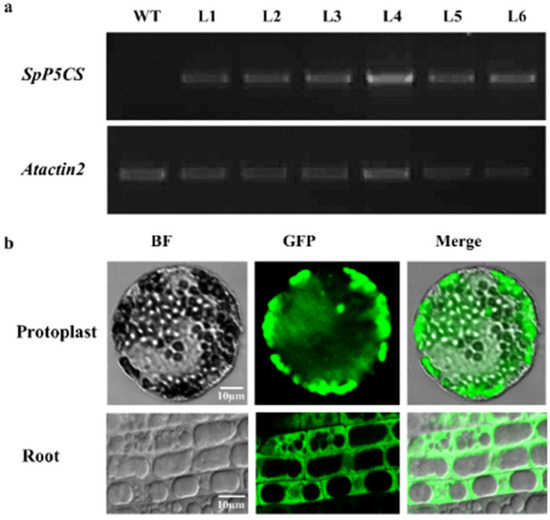 To further explore SpP5CS’s functions, we cloned the gene and transformed it into A. thaliana, with the expression being driven by the 35S Cauliflower mosaic virus promoter. The primers SpP5CS-GFP-F and SpP5CS-GFP-R were used to successfully identify the transgenic plants (Figure 3a). We received six transgenic lines, and the transformation efficiency was about 0.1%. We observed the SpP5CS-GFP fusion protein in the cytoplasm from transgenic A. thaliana using a laser confocal microscope (Figure 3b).