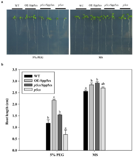 To analyze whether SpP5CS expression enhances the plant’s drought resistance function, the SpP5CS gene was first transformed into a P5CS deletion mutant to obtain a p5cs/SpP5CS complemented plant. Then, the WT, mutant, p5cs/SpP5CS-complemented and OE-SpP5CS A. thaliana seeds were cultured on 1/2 Murashige and Skoog (MS) medium supplemented with 5% PEG 6000 and ordinary 1/2 MS medium, and the phenotypes were observed. On 1/2 MS medium containing 5% PEG 6000, the average root length of the OE-SpP5CS plants was 2.17 cm, and the average root length of a mutant plants was 0.69 cm. The root lengths of OE-SpP5CS plants under drought conditions were significantly longer than those of the other types of plants, whereas the mutant plants themselves were significantly shorter than the other types of plants (Figure 4a,b). The average root lengths were 1.18 cm and 1.54 cm, respectively, on 1/2 MS medium, with no significant differences among the root lengths of the various plants.