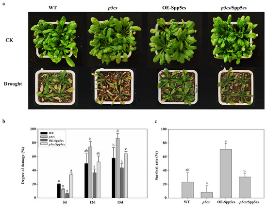 Phenotypic and membrane damage analyses of WT, OE-SpP5CS, p5cs/SpP5CS-complemented and p5cs mutant A. thaliana plants. (a) Phenotypes of WT, OE-SpP5CS, p5cs/SpP5CS-complemented and p5cs mutant plants in response to 12 days of soil drought stress. CK is the control group under the condition of normal irrigation; (b) Comparison of the degree of membrane damage among WT, SpP5CS, p5cs/SpP5CS-complemented and p5cs mutant plants in response to soil drought stress; (c) Comparison of the survival rates among WT, SpP5CS, p5cs/SpP5CS-complemented and p5cs mutant plants after 12 days of soil drought stress. The soil drought treatment adopts continuous withholding water. The experiment has three biological and technical replicates. The data are expressed as the mean ± SD from three independent experiments. Different letters indicate significant differences in the degree of damage or survival rate (one-way ANOVA, Tukey’s test, p < 0.05).