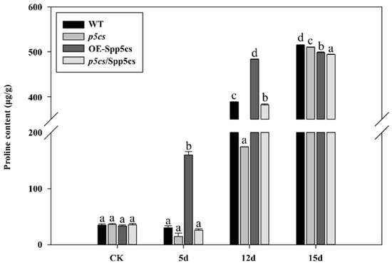 To investigate the effects of SpP5CS, the proline content was determined for WT, p5cs mutant, p5cs/SpP5CS-complemented and OE-SpP5CS A. thaliana using the acidic-ninhydrin assay. After 5 d of drought treatment, the proline content of the OE-SpP5CS A. thaliana was significantly higher than the other plant types and more than five times that of the WT. At this time, the proline content of the mutant was the lowest among all the plants at approximately half the WT value. After 12 d of drought treatment, the proline content of the OE-SpP5CS A. thaliana was still the highest, but the differences compared with the WT decreased. The mutant still had the lowest content. After 15 d of drought treatment, the proline contents of the plants were nearly the same (Figure 6). These results indicate that the SpP5CS gene improves the drought resistance of plants by increasing their proline content.
