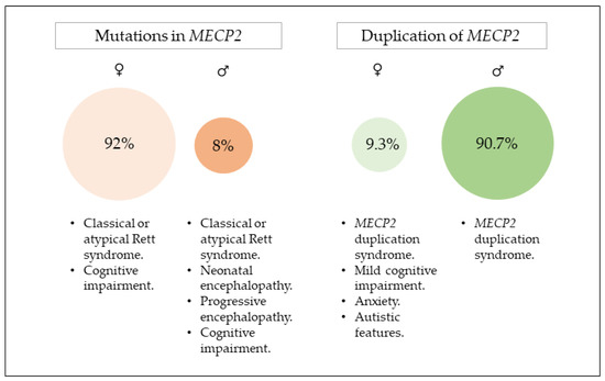 Several specific MECP2 mutation screenings have been performed in males affected by neurological disorders. In all of them, a low frequency of variants in MECP2 was found [22,23,24,25]. RettBASE is an international curated database, which gathers the genetic variation found in individuals with RTT and related clinical disorders. To date, there have been 3924 female cases with mutations in MECP2 and 345 male cases. As in females, in males, mutations range from single nucleotide changes to larger deletions involving up to 240 nt [26,27]. Small duplications from one to seven nucleotides have also been reported in RettBASE. The disparity of cases for each sex and the difficulties in creating the first male mouse model suggested that mutations in MECP2 in males were lethal. Fortunately, different groups have reported new patients and, nowadays, we know that the effects of these mutations range from severe neonatal encephalopathies and premature death (as in the case of c.806delG [26]) to mild intellectual and psychomotor impairment (as in c.608C > T [19]) and that they are not always related to RTT.