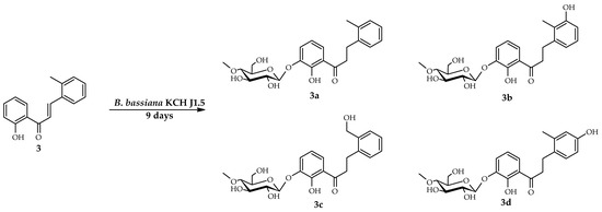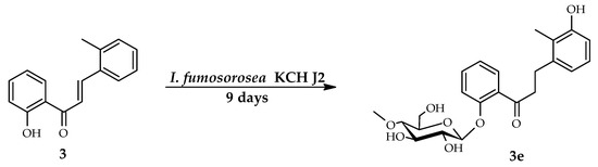 I. fumosorosea KCH J2 was the only one to biotransform 2′-hydroxy-2-methylchalcone (3) into 3-hydroxy-2-methyldihydrochalcone 2′-O-β-D-(4″-O-methyl)-glucopyranoside (3e) The isolated yield of (3e) was 5.3% (4.8 mg) (Scheme 7).