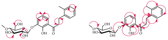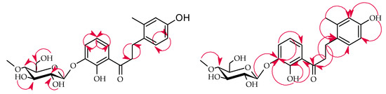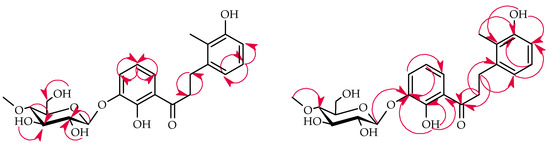 In the product (3b) (2′,3-dihydroxy-2-methyldihydrochalcone 3′-O-β-d-(4″-O-methyl)-glucopyranoside), in the 1H NMR spectrum, the singlet from the proton of the hydroxyl group also appeared (δ = 8.16 ppm) and shifted signals from B ring were observed: one triplet from the proton at C-5 (δ = 6.92 ppm) and one doublet of doublets from the protons at C-6 and C-4 (δ = 6.72 ppm) indicating that the attachment of an electronegative hydroxyl group occurred at C-3 (Supplementary Materials: Figure S39). Moreover, in the HMBC experiment hydroxyl group at C-3 (δ = 8.16 ppm) was correlated with C-2 signal (δ = 123.2 ppm) and C-3 signal (δ = 156.3 ppm shifted from δ = 131.8 ppm in substrate (3)) (Supplementary Materials: Figure S52). The signal from the methyl group at C-2 (δ = 2.21 ppm) was also correlated with shifted C-3 signal (Supplementary Materials: Figure S54) (Scheme 4).