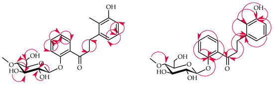 The structure of product 3e was established based on the NMR spectroscopy (Table 1 and Table 2, Scheme 8 (with key COSY and HMBC correlations). The resulting compound was 4″-O-methylglycosylated dihydrochalcone, like products (3a–3d). However, in this case, glycosylation occurred at C-2. In the 1H NMR spectrum signal from the hydroxyl moiety at C-2′ (δ = 12.88 ppm) disappeared, indicating substitution at this position. At δ = 8.08 ppm appeared singlet from one proton demonstrating substrate hydroxylation at another position (Supplementary Materials: Figure S95). The three-proton signal of the methyl moiety at C-2 was shifted from δ = 2.51 ppm to δ = 2.19 ppm (like product (3b)) indicating an electronegative atom’s attachment in the adjacent position at C-3. Moreover, in the HMBC experiment, the signal from the hydroxyl group at C-3 (δ = 8.08 ppm) was coupled with the shifted signal from the carbon at C-3 (δ = 131.8 ppm in (3), δ = 156.1 ppm in (3e)) and triplet from one proton at C-5 (δ = 6.90 ppm) was also coupled with the signal from carbon at C-3 (Supplementary Materials: Figure S107). The substitution with the 4″-O-methylglucosyl moiety at C-2′ was confirmed by coupling between the signal from proton at the anomeric carbon atom (δ = 5.04 ppm) and the signal from carbon at C-2′, which was shifted from δ = 164.5 ppm to δ = 157.1 ppm (Supplementary Materials: Figure S109). The coupling between proton at 6′ (δ = 7.58 ppm), proton at C-4′ (δ = 7.47 ppm), proton at C-3′ (δ = 7.30 ppm) and carbon at C-2′ also confirmed glycosylation at C-2′ (Supplementary Materials: Figure S107).