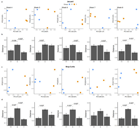 We found a significant difference between T and TF groups based on the beta diversity matrices, which suggests their microbiota compositions are significantly different. Principal coordinates analysis (PCoA) analysis based on Jaccard and Bray–Curtis dissimilarity matrices both showed that samples from the T group were separated from the TF group (Figure 4a,b). Notably, we found that samples collected at the same time also showed a tendency to cluster together. Jaccard and Bray–Curtis distance clearly distinguished the two groups. We also examined the dissimilarity distance within and between T and TF groups and found significantly higher dissimilarity distance between groups than within groups (Figure 4c,d).