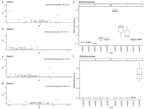 Comparison of microbiota profiles at the family level with ANCOM showed that Akkermansiaceae and Enterocaceae had significantly higher abundance in the T group at (a) week 4, (b) week 6, (c) week 5, and (d) week 8. The relative abundance of (e) Akkermansiaceae and (f) Enterococcaceae family at weeks 4, 5, 6, 7, and 8 in group T and group TF. Akkermansiaceae was more abundant at weeks 4, 5, and 6 while Enterococcaceae was more abundant at week 8 in group T.