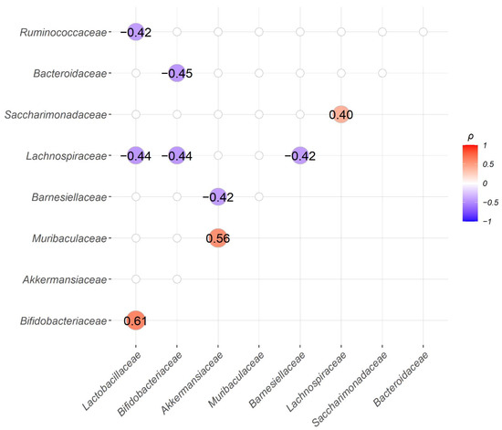 We also explored the correlations between the abundance of bacteria families. We found three significantly positively correlated pairs, Bifidobacteriaceae and Lactobacillaceae; Muribaculaceae and Akkermansiaceae; Saccharimonadaceae and Lachnospiraceae. Among them, both Bifidobacteriaceae and Lactobacillaceae are well-recognized probiotic bacteria and their abundancies were frequently found positively correlated with each other [27]. Similar to Akkermansiaceae, Muribaculaceae was also found moderately enriched in group T in LEfSe analysis at the 5th, 6th, and 8th week with LDA score > 3. On the other hand, Lactobacillaceae showed significant negative correlations with Ruminococcaceae and Lachnospiraceae. Bifdobacteriaceae showed significant negative correlations with Bacteroidaceae and Lachnospitaceae. Additionally, Barnesiellaceae was found to be statistically significantly negatively correlated with Akkermansiaceae and Lachnospiraceae (Figure 7).