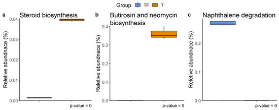 Different abundant KEGG metabolic pathways. (a) Steroid biosynthesis, (b) butirosin and neomycin biosynthesis, and (c) naphthalene degradation were found at week 4, week 7, and week 8, respectively. The relative abundance of function predicted by PICRUSt2 showed the different abundance of taxa predicted to have a specific function in T and TF groups. The BH adjusted p values from White’s non-parametric t-test are shown at the bottom of the box plots.