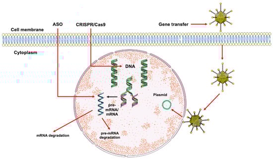 Endogenous pathways may be exploited to achieve therapeutic gene manipulation. Antisense oligonucleotides (ASOs) complementary to nuclear pre-mRNAs or cytoplasmic mRNAs exploit the RNAse-mediated pathway, binding to complementary sequences to induce their degradation. This process may occur both in the nucleus and in the cytoplasm. Clustered regularly interspaced short palindromic repeats (CRISPR)/CRISPR-associated protein 9 (Cas9) acts on double-stranded DNA, causing breakage at target sites in the genome. Gene transfer is achieved via viral vectors, usually an adeno-associated virus or a lentivirus, that are used to carry complementary DNA sequences into the cells, to induce the expression of one or more particular genes. Figure modified from images from Servier Medical Art, licensed under a Creative Common Attribution 3.0 Generic License. http://smart.servier.com/, accessed on 25 July 2021.