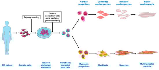 Embryonic stem cells (ESCs) are pluripotent cells that have an unlimited proliferative capacity and the ability to self-renew and differentiate into virtually all tissues of the three embryonic germ layers []. However, the use of human ESCs is controversial from an ethical point of view. In 2006, Takahashi and Yamanaka reached a fundamental scientific milestone by discovering a method for reprogramming adult somatic cells into pluripotent stem cells []. These cells were named induced pluripotent stem cells (iPSCs, human iPSCs (hiPSCs)) and are now widely used as models for different human diseases, including MDs [,]. hiPSCs advantageously harbor the natural MD mutation in the context of the whole human genomic background, which cannot be reproduced in animal models.