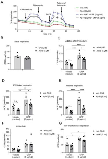 2.2. Reduced Mitochondrial Respiration in Platelets Following Aβ40 Treatment
