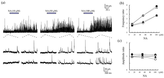 Noradrenaline (NA) increased the frequency ratios of sIPSCs in the SG neurons in a concentration-dependent manner (Figure 1a,b) but had no effect on the amplitude ratios (Figure 1c). These results indicated that the responsiveness to NA in terms of the frequency of sIPSCs is concentration-dependent in SG neurons.