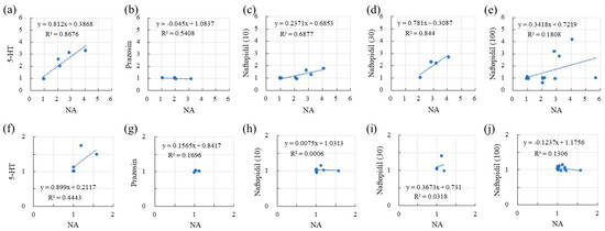 The association between NA (50 μM) and each ligand in terms of the response ratios of Table 1. HT (50 μM) (a), prazosin (10 μM) (b), and naftopidil (10, 30, and 100 μM) (c–e, respectively). Similarly, for amplitude, the associations with NA of 5-HT (50 μM) (f), prazosin (10 μM) (g), and naftopidil (s10, 30, and 100 μM) (h–j, respectively) are presented. The x and y axes reveal the ratio of frequency or amplitude of sIPSCs after adding the drugs (NA, 5-HT, prazosin, or naftopidil) to before the adding in the single SG neuron.
