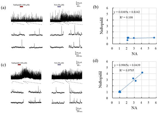 A stratified analysis of the sIPSCs for the frequency ratio response to NA (50 μM) and naftopidil (100 μM). The SG neurons exposed to naftopidil (100 μM) showed either a poor response (a,b) or a good response (c,d). Typical traces of both types are shown for a single SG neuron in (a,c), respectively. The associations of the response ratios between NA and naftopidil are plotted for each SG neuron (b,d). The x and y axes reveal the ratio of frequency or amplitude of sIPSCs after adding the drugs (NA, 5-HT, prazosin, or naftopidil) to before the adding in the single SG neuron.