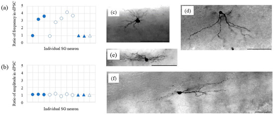 Responsiveness to naftopidil (100 μM) in terms of frequency (a) and amplitude (b) of sIPSCs with stratification by morphology of SG neurons. After recording the sIPSCs, dye was injected into the SG neurons. Then, the neurons were observed under a light microscope. Closed circles, radial; open circles, vertical; closed triangles, central; and open triangle, islet. Typical images of the SG neurons are shown: radial (c), vertical (d), central (e), and islet (f). Scale bars = 100 μm.