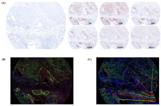 Multiplexed immunofluorescence staining was performed using PerkinElmer Opal 7-Color Manual IHC kit (Perkin-Elmer, Waltham, MA, USA). TMA tissue samples were acquired as 4 μm thick sections and placed on plus charged slides. After deparaffinization, tissue samples were rehydrated and antigen was collected in citrate buffer (pH 6.0) using microwave treatment. The following five steps of multiplex immunohistochemistry were followed consecutively for each marker: blocking was performed with antibody diluent (ARD1001EA, PerkinElmer, Waltham, MA, USA), followed by incubation with primary antibody for 1 h, detection using Opal Polymer HRP Ms + Rb secondary antibody (ARH1001EA, PerkinElmer, Waltham, MA, USA), and visualization using Opal tyramide signal amplification (TSA) plus agent, after which the section was placed in citrate buffer (Ph 6.0) and heated using microwave treatment. The primary antibodies and corresponding TSA used for each protein were as follows: anti-CK (AE1/AE3, M3515, Dako, CA, USA) and Opal 520 for CK, anti-PD-L1 (E1L3N, #13684, Cell Signaling, Danvers, MA, USA) and Opal 540 for PD-L1, anti-CD20 (L26, ab133616, Leica, Wetzlar, Germany) and Opal 570 for CD20, anti-CD4 (EPR6855, NCL-L-CD20-L26, Abcam, Cambridge, MA, USA) and Opal 620 for CD4, anti-CD8 (4B11, NB100-65729, Novusbio, Centennial, CO, USA) and Opal 650 for CD8, and anti-FoxP3 (236A/E7, ab20034, Abcam, Cambridge, MA, USA) and Opal 690 for FoxP3. The methods have been introduced in detail in previous studies [,].