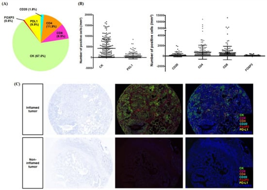 The diverse immune cellular densities and the quantitative values of each immune marker. We obtained the simultaneous staining result of multiple biomarkers, including CK, CD8, CD4, CD20, FoxP3, and PD-L1. After simultaneous staining, automated phenotyping was possible, and the quantitative analysis for positive cellular densities of positive cells was conducted. (A) Among six markers, the positive proportion was high in orders of CD4, PD-L1, CD8, CD20, and FoxP3, excluding CK. (B) The quantitative value of each marker was shown individually different. (C) The inflamed tumors were clearly indicated in the phenotyping view of Opal staining, as shown in the middle view.