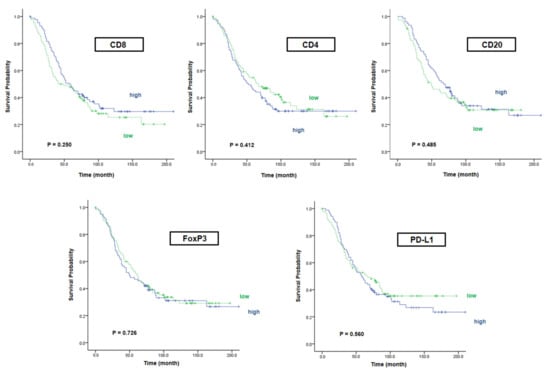 We divided 187 patients with HGSOC into higher expressed group and lower expressed group based on the median value of each marker except CK. The median OS in the high CD8/low CD8 group was 58 and 42 months, respectively (p = 0.250). In the case of CD4 and CD20, there was no significant difference in survival rates either (median OS in CD4: 52 vs. 67 months, p = 0.412) (median OS in CD20: 67 vs. 50 months, p = 0.485). In addition, the median OS in the high FoxP3 group was not different compared with the low FoxP3 group (50 vs. 61 months, p = 0.726). Likewise, the difference between survival rates of patients with high PD-L1 and low PD-L1 was not significant (58 vs. 67 months, p = 0.560). As a result, any single immune marker was not related to survival rate, including CD8, which was a representative marker of CTL; FoxP3 in Treg; and PD-L1, which has been known as a prognostic marker in ovarian cancer but is under debate (Figure 3).