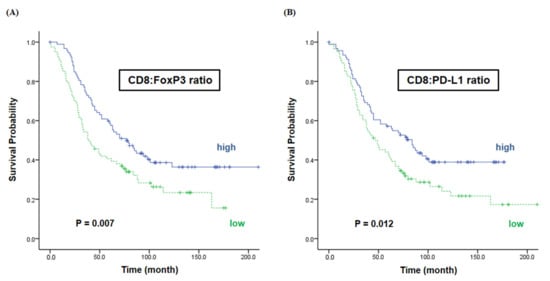 Interestingly, we found that the expression of immune markers with different characteristics in the tumor microenvironment affected the survival rate when measured in their proportion. The survival in the high ratio of CD8 to FoxP3 group was better than in the low ratio group (77 vs. 39 months, p = 0.007) (Figure 4A). Furthermore, the median OS was significantly different between the high and low CD8 to PD-L1 ratio groups, with 84 months and 47 months, respectively (p = 0.012) (Figure 4B).