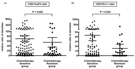 Platinum sensitivity according to ratios of CD8:FoxP3 and CD8:PD-L1. We classified patients according to their clinical response to frontline chemotherapy (paclitaxel/carboplatin) and analyzed CD8 to FoxP3 or PD-L1 expression ratio in two patient groups. (A) CD8:FoxP3 ratio seemed to be high in the chemotherapy-sensitive group; however, it was not significant (p = 0.052). (B) CD8:PD-L1 ratio was significantly higher in the chemotherapy-sensitive group (p = 0.034). (∆, CD8:FoxP3 ratio and CD8:PD-L1 ratio in chemotherapy sensitive group, respectively; ●, CD8:FoxP3 ratio and CD8:PD-L1 ratio in chemotherapy resistant group, respectively).