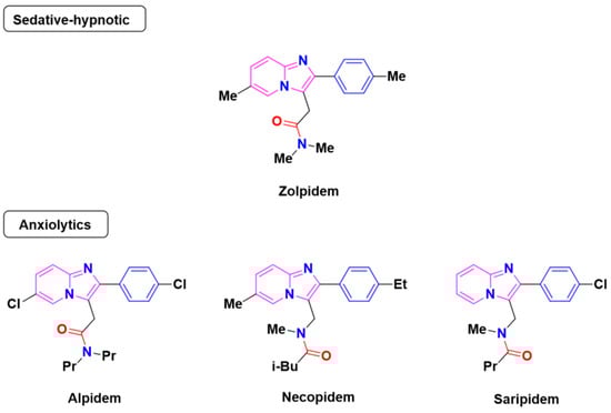 Chemical structures of different α1-GABAAR PAMs. Zolpidem and its analogues contain an imidazopyridine (magenta), an amide moiety (red) and an aromatic ring (blue).