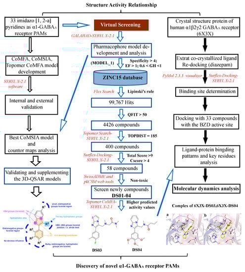 In this study, an integrated set of computational methodologies was used to explore the novel hit compounds of α1-GABAAR PAMs. The 3D-QSAR models were constructed based on 33 imidazo [1,2-a]-pyridines, to visually understand the effect of diverse substitutions on the activity of these GABAAR PAMs. The molecular docking studies revealed the interaction patterns of these PAMs in the BZD pocket, indicating that these imidazo [1,2-a]-pyridines could form key hydrogen bonds with the residues Ser205 (α1) and Ser206 (α1), and could form hydrophobic or π–π stacking interactions with the residues Phe100 (α1), His102 (α1), Tyr160 (α1), Val203 (α1), Tyr210 (α1), and Phe77 (γ2). These interactions might be essential for the bindings or activities of these GABAAR PAMs. The pharmacophore model further confirmed that the hydrophobic aromatic ring and the side chain of the acylamino group were important pharmacophore features. The best pharmacophore model, containing six key features, was in accordance with the 3D-QSAR models and docking results. The virtual screening based on the best pharmacophore model, Topomer Search, molecular dockings, ADME/T predictions, and MD simulations finally confirmed four newly hit compounds (DS01–DS04). The compounds DS03 and DS04 could steadily bind to the 6X3X protein in the dynamic environment, and this was further corroborated by the binding energy analysis; however, its synthesis and biological activity remain to be further studied. We believe that these findings could provide profound theoretical direction and information for the further design and development of novel α1-GABAAR PAMs with good antipsychotic activities.