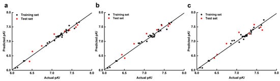 The scatter plots of the actual and predicted activities of all the compounds, by the three models, are shown in Figure 3. The statistical points of all the compounds showed a good linear correlation, which further proved that the 3D-QSAR models have high reliability for predicting the activity of those imidazo [1,2-a]-pyridines as GABAAR PAMs.