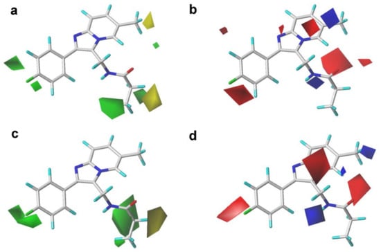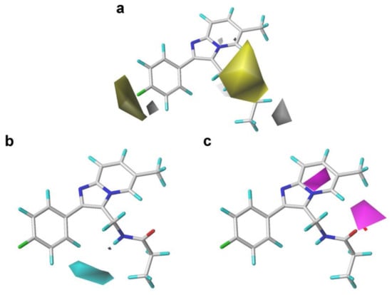 The HBD and HBA contours of the CoMSIA model are given in Figure 5. As shown in Figure 6b, a small cyan contour near the C4′ position substituent demonstrated that the presence of HBD groups at this position might favor the activity. This could be corroborated by the following active order: 11 (-F) > 04 (-H). Furthermore, a large cyan contour near the C3 position substituent of the imidazole ring, and a medium-sized contour were observed near the 3-methylpropionamide substituent on the imidazole ring, demonstrating that HBA groups were favorable for the activity at these positions. These results could well explain why the activities of compounds 14–33 (-CO-) were superior to those of compounds 07–09 (-NH-). In addition, two medium-sized magenta contours near the N atoms of the imidazo [1,2-a]-pyridine ring manifested that the existence of a HBA group on the common scaffold might be significant for the activity. These observations were consistent with a previous study that the 3-methylamide group and the imidazo [1,2-a]-pyridine ring of those PAMs were essential for the bioactivity, as they could serve as HBDs or HBAs to interact with the GABAAR protein [26,27,30].
