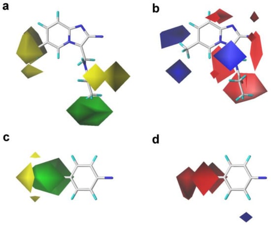 Contour maps of the steric and electrostatic fields of the CoMFA and CoMSIA models with compound 14 as a template. (a) The steric contour map of the CoMFA model; (b) the electrostatic contour map of the CoMFA model; (c) the steric contour map of the CoMSIA model; (d) the electrostatic contour map of the CoMSIA model.