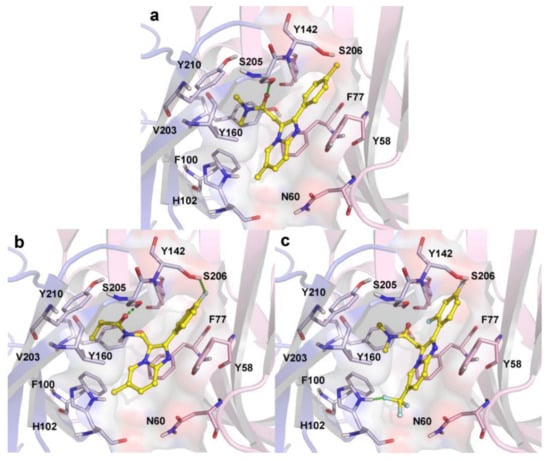 The CoMFA, CoMSIA, and Topomer CoMFA contour maps with the most potent compound 14 as a reference are shown in Figure 4, Figure 5 and Figure 6, respectively. It can be clearly found that the S and E contour maps of the CoMFA models were similar to those of the CoMSIA model.