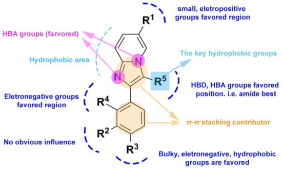 According to the analyses of the 3D-QSAR models, the suitable substituents for increasing the activity of these PAMs at specific regions might be concluded as follows: (1) small group and/or electropositivity at the C6 position of the imidazo [1,2-a]-pyridine ring; (2) bulky, negative-charged, and/or hydrophobic groups at the C4′ position of the phenyl ring; (3) negatively charged groups at the C2′ position of the phenyl ring; (4) hydrophilic groups at the C3 position of the imidazo [1,2-a]-pyridine core; (5) 3-methylamide group at the C3 position of the imidazo [1,2-a]-pyridine core as HBDs or HBAs; (6) HBDs groups at the para-position of the phenyl ring at the C4′ position. Generally, the established 3D-QSAR models were dependable, and could provide a theoretical basis for the design and synthesis of novel efficient PAMs.