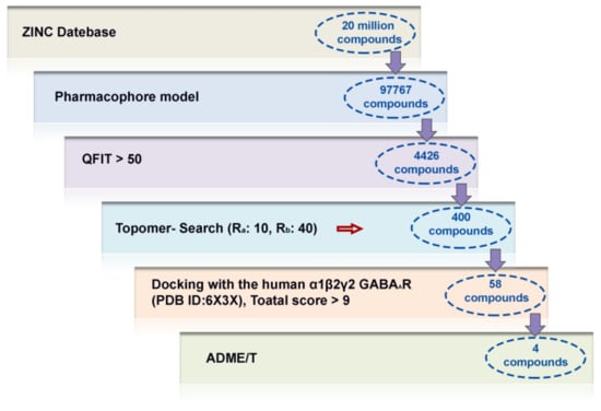 To better explore the crucial pharmacological characteristics of the newly found α1-GABAAR PAMs, and design more-efficient antipsychotic agent leads, herein, 33 imidazo [1,2-a]-pyridine PAMs of GABAARs were selected to perform a systematic modeling study, including three-dimensional quantitative structure–activity relationship (3D-QSAR) models, pharmacophore models, molecular dockings, and molecular dynamics (MD). This study could be clearly illustrated by the following flow chart (Figure 2). To find novel α1-GABAAR PAMs, virtual screening was then performed based on the best pharmacophore model combined with Topomer Search, molecular dockings, and ADME/T predictions. MD simulations were subsequently utilized to monitor the real-time dynamic conformation of screened hits and the stabilization of protein–ligand complexes. Our research results might provide important information and more alternatives for the design and exploration of novel GABAAR PAMs.