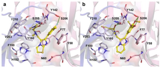 Zolpidem was located at the α1/γ2 interface in an oblique insertion, the imidazopyridine ring pointed down in the binding pocket towards His102 (loop A of α1 subunit), and the carbonyl group pointed to loop C. There was a key hydrogen bond formed between the carbonyl oxygen atom and Ser205 in loop C (Ser205-O-H…O-C, 1.8 Å). The dimethyl amide side chain embedded into the hydrophobic pocket that was generated by the surrounding amino acid residues, Phe100, His102, Tyr160, Val203, and Tyr210. Additionally, the π–π stacking interaction was also found between the imidazole ring of zolpidem and the benzene ring of the aromatic residues Phe77 (face-to-face) in loop D. All the observed interactions were consistent with the findings reported by Tikhonova et al. [30,34,35]. Compound 14, with the highest potency, and compound 08, with the lowest activity, were selected to concretely analyze the interaction patterns of these PAMs in 6X3X (Figure 8b,c). The docking score of compound 14 (6.91) was higher than that of compound 08 (5.11), which was consistent with their experimental activities. Furthermore, it was noted that compounds zolpidem, 14, and 08 have similar binding orientations and interactions in the binding pocket. Similarly to zolpidem, the imidazole ring, as the common skeleton of compounds 14 and 08, formed a π–π stacking interaction with the aromatic Phe77 (γ1). The dimethylamide side chain of compound 08, and the propanamide moiety of compound 14 were involved in hydrophobic interactions with surrounding amino acid residues. The carbonyl group of compound 14 (Figure 8b) formed a hydrogen bond with the key residue Ser205 (Ser205-O-H…O-C, 1.5 Å). However, this crucial hydrogen bond was not observed in the docking results of compound 08 (Figure 8c). This result was in agreement with the HBA contours of the 3D-QSAR analysis. In addition, the F atom was present at the para-position of the phenyl ring of compound 14, as a HBA formed a hydrogen bond with Ser206 (Ser206-O-H…F-Phenyl, 2.6 Å), and this additional weak hydrogen bonding was also presented in the docking result of compound 08. The higher docking score of compound 14 might be due to the stronger hydrogen bond formed with Ser205 (α1), and the deeper binding and rotation of the 3-methylpropionamide part in the hydrophobic pocket.