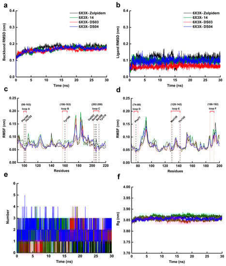The time-dependent behavior of the complexes 6X3X-DS03 and 6X3X-DS04 in the 30 ns simulation trajectory frames were analyzed using the complexes 6X3X-zolpidem and 6X3X-14 as the comparisons, and their results were summarized in Figure 13. The RMSD analysis usually provides key information about the convergence and stability of these complex systems [37]. We could observe the RMSD values of the protein backbone atoms of four complexes stabilized after 5 ns MD simulations, converging at 0.20 nm (Figure 13a). From the thorough analysis of the trajectory frames, the RMSD values of the backbone atoms of complexes 6X3X-DS03 and 6X3X-DS04 were slightly lower than those of the other complexes. For the ligand RMSD values (Figure 13b), they fluctuated greatly in the 6X3X-zolpidem complex at the beginning of 20 ns, whereas they fluctuated at about 0.06 nm and 0.09 nm in the complexes 6X3X-DS03 and 6X3X-DS04, respectively. Similarly, the RMSD values of four ligands could reach equilibrium finally. Compared to zolpidem and compound 14, compounds DS03 and DS04 had relativity lower RMSD values and fluctuation, indicating a stable interaction or binding to the 6X3X protein. Moreover, the root mean square fluctuation (RMSF) of the Cα residues was computed to identify the structural changes induced by the ligand binding. The RMSF values of the residues in the loops A–F, where the BZD binding site is located, are depicted in Figure 13. From the RMSF trajectories, it is evident that the RMSF values of the most residues in the four complex systems showed similar fluctuations, which demonstrated that four compounds had the analogical binding modes. The RMSF values of the key residues of four complex systems are summarized in Table S2. The critical residues Phe100 (loop A), His102 (loop A), Tyr160 (loop B), Val203 (loop C), Ser205 (loop C), Ser206 (loop C), Tyr210 (loop C), and Phe77 (loop D), in the binding pocket, had relatively low RMSF values (<0.08). These results revealed that the critical residues in the four systems exhibited low flexibility, illustrating that the key interactions of all the compounds in the binding pocket might maintain stability.
