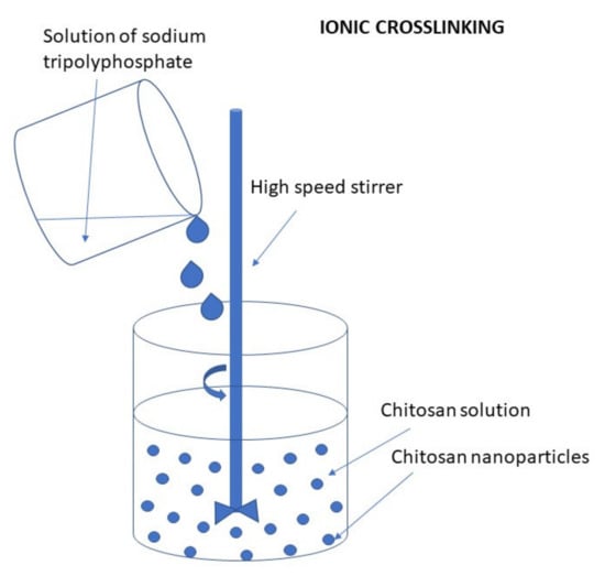 Ionic cross-linking (or also found in the literature as ionic gelation) is one of the most widely used methods for the preparation of CS NPs. It has been extensively used for loading biopharmaceuticals. A major advantage of this method of physical CS crosslinking is related to its mild conditions attained. This method avoids the use of organic solvents, high temperatures, or vigorous agitation. Therefore, it can retain bioactive molecules such as proteins, DNA, etc. [,].