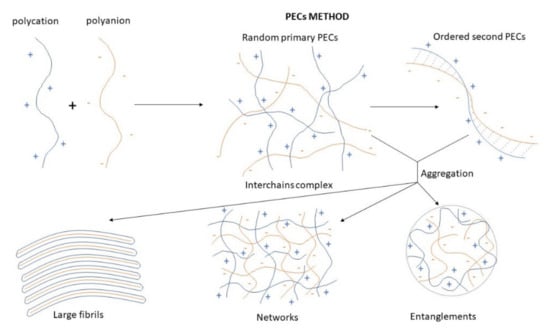 The PECs formation generally involves two or three steps. The scheme of the different steps of the polyelectrolyte complexes formation is shown in Figure 4. The first step is instantaneous and leads to the formation of a random primary complex with significant distortions of the configuration of polymer chains. Then, the secondary complex is formed by rearrangement of existing linkages within intracomplexes. It involves the formation of new bonds, e.g., electrostatic bonds, hydrogen bonds, hydrophobic interactions, etc. Finally, under certain conditions, primary and secondary complexes can aggregate (probably by hydrophobic interactions) and lead to various stable structures: entangled aggregates, fibrils, ordered networks, etc. Preparation of CS PECs is a safe green process in water, with no organic solvents nor chemical cross-linkers or surfactants used. It is a simple fabrication process where spontaneously mixing the oppositely charged polyelectrolyte solutions leads to interpolymer ionic condensation [].