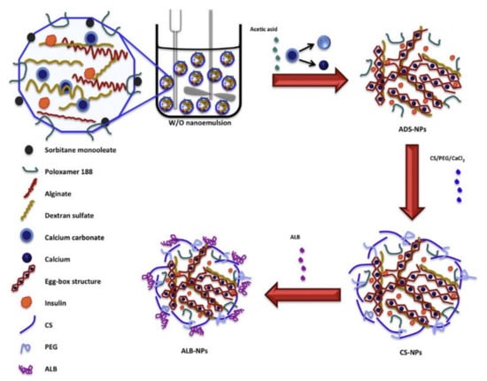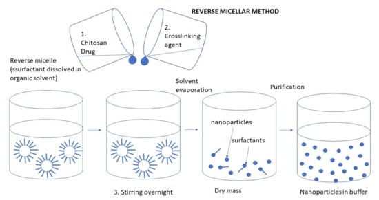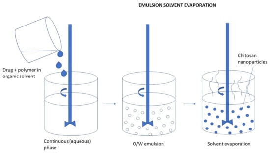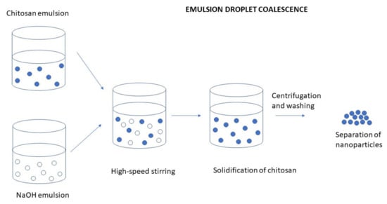 In general, the particles formed in the emulsion system have structures of nanocapsules, high drug loading efficiency, and good bioavailability []. NPs can be obtained using the nanoemulsion technique in various ways. Some of them are low power emulsification methods but emulsification processes usually require high mechanical energy to obtain small droplet sizes. The most common emulsification method used for the preparation of CS NPs is the water-in-oil emulsion, where an aqueous CS solution is emulsified in an oil phase. Surfactants are applied for stabilizing the formed particles [,].