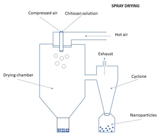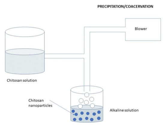 Processes of nanoparticulation can be divided into different categories: (i) physicochemical processes in which the NPs are precipitated by using preformed polymers, with yield induced by emulsification-solvent evaporation, diffusion, or reverse salting-out; (ii) by in situ chemical synthesis of macromolecules which lead to polymerizations or interfacial polycondensation reactions; and (iii) mechanical processes using high energy devices such as high-pressure homogenizers, ultrasonic devices, or wet high energy milling. Several methods have been reported for the preparation of CS NPs []. The main methods for producing CS NPs and nanocapsules (NCs) are ionic gelation, emulsification and crosslinking, complexation with polyelectrolytes, self-assembly, and drying processes []. The following subsections are describing the most important methods for the preparation of CS NPs, discussing also recent improvements in production schemes of conventional as well as novel CS NPs (such as optimized working parameters and conditions, new crosslinking agents, proper combinations of preparation schemes, etc.).