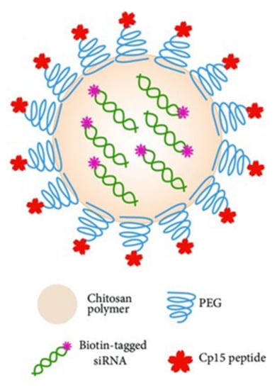 PEGylated CS. PEGylation (poly(ethylene glycol) is a technique to increase the circulation half-life of the particles leading to prolonged therapeutic effects, dose reduction, and improvement in patient compliance. PEGylated CS is usually unsuitable for mucus administration due to steric hindrance, which prevents close contact between the particles and the mucus, resulting in poor absorption. On the other hand, it is suitable for gene delivery since it can protect the model drug for a prolonged time to reach the targeted location []. Hsu et al. [] fabricated by self-assembly of the amphiphilic benzoic-imine-containing PEGylated CS/4-(dodecyloxy)benzaldehyde (DBA) conjugates in an aqueous solution of pH 7.4 to efficiently promote loading efficiency and aqueous photostability of indocyanine green (ICG). The resulting polymeric micelles were characterized to have a hydrophobic hybrid CS/DBA core surrounded by hydrophilic PEG shells. Importantly, the encapsulation of ICG not only promoted the ICG loading but also enhanced its aqueous photostability. The robust ICG-loaded polymeric micelles showed several superior properties including the inhibition of ICG leakage under the mimic physiological and acidic conditions, favorable biocompatibility, and photo-activated hyperthermia, and showed potential in cancer theranostic.