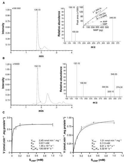 Kinetic parameters of BDPDE1. (A) Ion chromatogram of AMP with the inset showing the daughter AMP ion at m/z 136.10 [M + H]+. The fragmented product ion was used for quantitation of the phosphodiesterase activity. Inside is a calibration curve for AMP and GMP. (B) Ion chromatogram of GMP with the inset showing the daughter GMP ion at m/z 152.15 [M + H]+. The fragmented product ion was used for quantitation of the phosphodiesterase activity. (C) Michaelis–Menten plots for the cyclic nucleotide phosphodiesterase activity of BDPDE1. The Vmax for a cAMP substrate was 2.45-nmol AMP min−1 mg protein−1 and a KM of 0.011 mM, respectively. The Vmax for a cGMP substrate was 1.01-nmol GMP min−1 mg protein−1 and a KM of 0.113 mM, respectively. The reaction time was 25 min, and the standard reaction mixture contained: 3-mM Tris-HCl (pH 8.0), cAMP or cGMP in a concentration ranging from 0.01 mM to 1 mM, 0.1 % (v/v) 2-mercaptoethanol, 5 µg of GST-BDPDE1 and 0.5-mM MgCl2 and MnCl2 in a final volume of 100 μL.