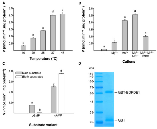 Characterization of the biochemical properties of BDPDE1. (A) Influence of temperature on the PDE activity. The enzymatic activity was tested in the temperature range from 10 °C to 45 °C. The reaction time was 25 min in the standard reaction mixture containing 0.1-mM cAMP and 5 µg of GST-BDPDE1. (B) Effect of divalent cations and inhibitor on the PDE activity of GST-BDPDE1. The reaction was carried out in the standard reaction mixture containing 0.1-mM cAMP, 5 µg of GST-BDPDE1 and, depending on the reaction variant, 0.5-mM MgCl2 and/or MnCl2, and 50-μM IMBX was added. (C) Substrate specificity of GST-BDPDE1. The reaction was performed in the presence of 5 µg of GST-BDPDE1, and depending on the substrate variant, 0.1-mM cAMP and/or 0.1-mM cGMP was added. In all the error bars, different letters indicate significant differences at p < 0.05. (D) The purified GST-BDPDE1 protein (4 μg) was analyzed by SDS-PAGE.