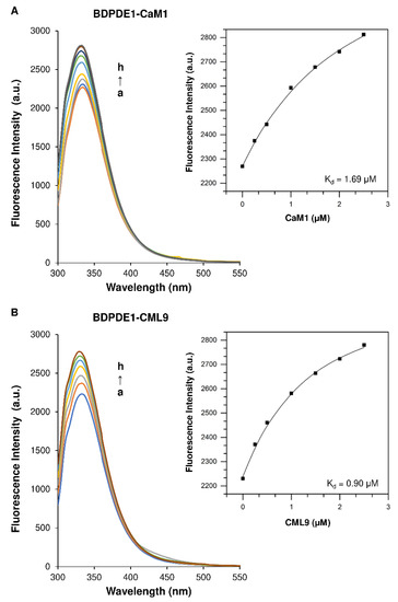 Calcium-dependent cellular processes are regulated through intracellular Ca2+-binding proteins, of which the best-studied are calmodulin (CaM), calmodulin-like proteins (CMLs) and calcium-dependent protein kinases (CDPKs). These proteins bind Ca2+ ions through the EF hand motif, a conserved helix–loop–helix structure that binds a single Ca2+ ion, thereby causing a change in the conformation that, in turn, can activate target proteins or cause self-activation [31,32,33,34]. Since it was reported that CaM/Ca2+ affects the activity of group I animal PDEs and the PDE domain of the ATKUP5 [17,35] and that a protein sequence analysis revealed that BDPDE1 also contains a predicted CaM-binding site between amino acids 50 and 70, we investigated the possible interactions of CaM and CaM-like isoforms with plant PDE using fluorescence spectroscopy. Due to the high structural similarities of CaM isoforms, we chose one representative of the CaM, using CaM1 and CaM-like isoform 9 (CML9). The BDPDE1 fluorescence spectra in the presence of CaM1 and CML9 at 37 °C are shown in Figure 3. The control emission spectra of BDPDE1, the buffer (TRIS), CaM1 and CML9 are shown in Supplementary Figure S1.