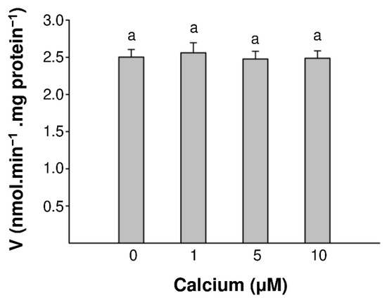 Given that, in plants, many proteins have been reported as calcium-binding (e.g., CDPKs (calcium-dependent protein kinases), SnRKs (SNF-related serine/threonine-protein kinases) or SOSs (salt overly sensitive) and responsive to calcium [32,38], we wanted to determine if we could rule out the possibility of a nonspecific increase in activity due to the presence of Ca2+. Therefore, we tested the effect of different concentrations of Ca2+ ions (0–10 µM) on the BDPDE1 enzymatic activity and noted no significant differences in the enzyme activities (Figure 5). This is consistent with no unspecific binding of Ca2+ to BDPDE1.