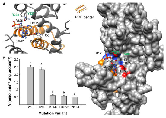 Computational assessment of the PDE catalytic center in BDPDE1. (A) The PDE center of BDPDE1 is shown as orange in the surface model (right) and as individual atoms in the ribbon model (left). The PDE center is solvent-exposed and occupies a distinct cavity that docks cAMP with a binding affinity of −4.9 kcal/mol. Key amino acids in the original PDE motif [YFW]Hx[YFW]Rx{20,40}[HRK][DE] reported in Reference [17] and in the expanded PDE motif [AYFW]Hx[LEYFW]Rx{20,40}[HRK][DE]x{60,90}Rx{3}[YFW] constructed in this study are labeled black and green, respectively. These amino acids, which could interact with cAMP at the PDE center, are colored according to their charges in the surface model and as individual atoms in the ribbon model. The BDPDE1R80-A315 3D structure modeled against the crystal structure of a metal-dependent HD domain-containing hydrolase from B. halodurans (PDB ID: 3DTO) using MODELLER (ver. 9.25) [39] and cAMP docking simulations were performed using AutoDock Vina (ver. 1.1.2) [40]. Molecular graphics and analyses were performed with the UCSF Chimera package [41]. Chimera was developed by the Resource for Biocomputing, Visualization, and Informatics at the University of California, San Francisco (supported by NIGMS P41-GM103311). (B) The effect of site-directed mutagenesis on PDE activity. Mutations of H155G, D156G and Y237E in the wild-type (WT) BDPDE1 domain significantly reduced the enzyme activity, while L124E did not affect the activity. The reaction time was 25 min, and the standard reaction mixture contained 0.1-mM cAMP and 5 µg of the mutated protein. Different letters indicate significantly different values as compared to the control sample (p < 0.05).
