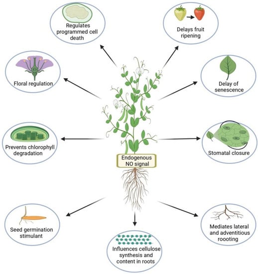 Role of No in plant growth and development. (Made with Biorender.com (accessed on 3 September 2021)).