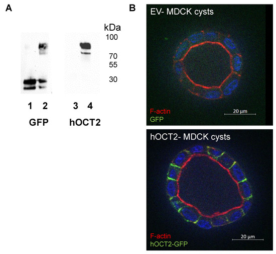 Characterization of MDCK cysts. Panel (A) shows a western blot analysis of lysates from the MDCK cells stably expressing the EV (lanes 1 and 3) or hOCT2-GFP (lanes 2 and 4) constructs. The membranes were incubated with antibodies against GFP (lanes 1 and 2) or against hOCT2 (lanes 3 and 4). Cells expressing EV displayed two bands below the 30 kDa molecular weight marker under GFP detection, probably corresponding to GFP alone and its degradation product (lane 1). The labeling for hOCT2 in EV-expressing cells did not show any signal at the hOCT2 molecular weight (lane 3). Cells expressing hOCT2-GFP displayed two bands between 100 and 70 kDa under GFP detection, probably corresponding to glycosylated and non-glycosylated hOCT2-GFP (lane 2). Staining for hOCT2 revealed the same bands detected with an anti-GFP antibody between 100 and 70 kDa (lane 4), indicating that these cells expressed the hOCT2-GFP construct. Panel (B) shows an immunofluorescence analysis of the EV (upper panel) and hOCT2-GFP (lower panel) expressing MDCK cells growing in BME2 gel. These cells built cysts with a distinct basolateral and apical membrane domain. F-actin staining showed the apical membrane in red in both preparations. Only in hOCT2-GFP-expressing cysts was a clear GFP signal observed at the basolateral plasma membrane domain (green color, lower panel). Scale bar = 20 µm.