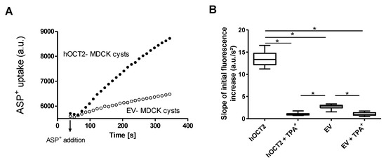 As shown in Figure 2B, the uptake of 4 µM ASP+ in the hOCT2 cysts (hOCT2) was almost completely inhibited by the simultaneous treatment with a high tetrapentylammonium (TPA+, a potent inhibitor of OCT [21,27]) concentration (1 mM) in the uptake buffer. Even though the ASP+ uptake in the GFP cysts (EV) was much smaller, it was still significantly inhibited by 1 mM TPA+.