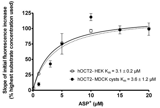 2.3. Comparison of ASP+ Transport Mediated by hOCT2 Stably Expressed in HEK293 (hOCT2-HEK) Cells or in MDCK Cysts (hOCT2- MDCK)