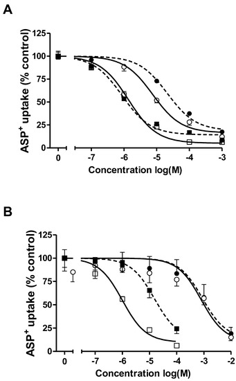 - Ciarimboli, G.; Schlatter, E. Organic cation transport measurements using fluorescence techniques. In Neurotransmitter Transporters: Investigative Methods; Bönisch, H., Sitte, H.H., Eds.; Springer Science and Business Media: New York, NY, USA, 2016; pp. 173–187. [Google Scholar]
